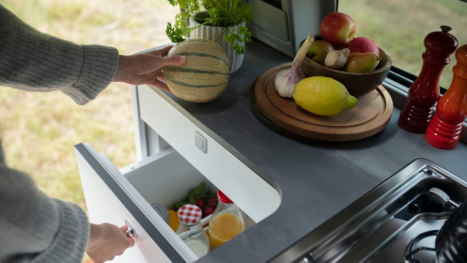 Reconfigured to be more practical than ever. The new Transit Custom Nugget kitchen layout includes 20% more worktop space. A practical 33L drawer fridge. Plus soft-close latches and pop-out handles for easy access.